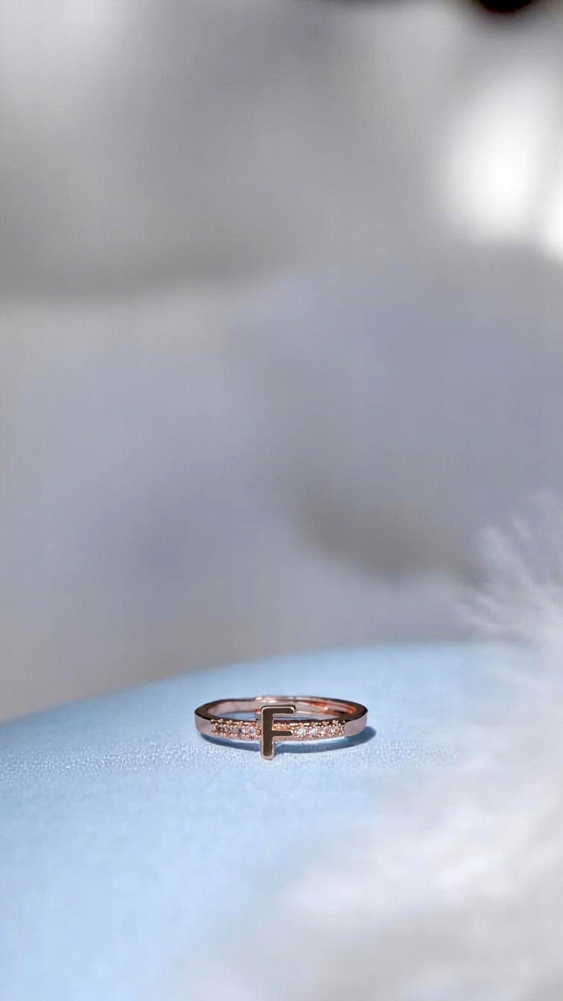 A minimal ‘F’ alphabet ring in rose gold that flatters every outfit with a soft Korean sparkle.