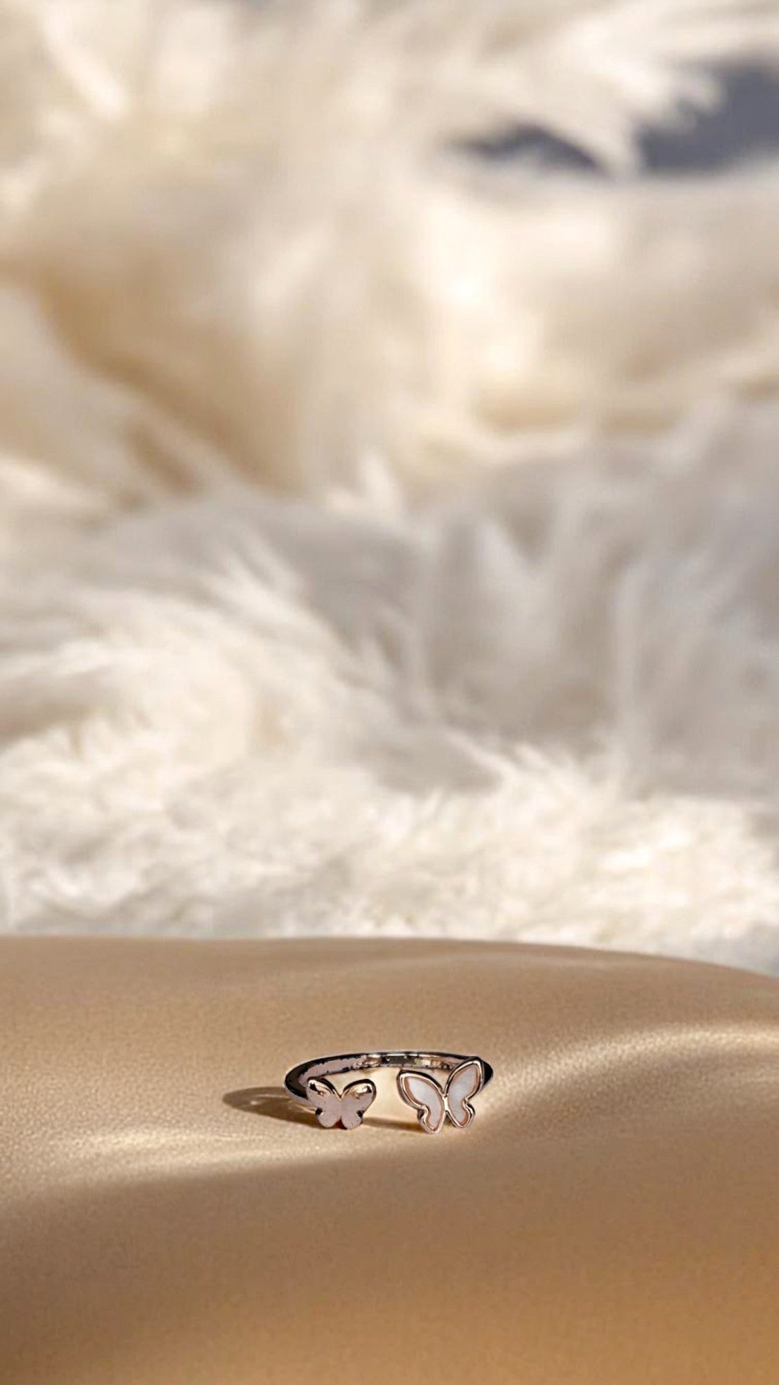A double butterfly ring – one solid, one semi-translucent – symbolizing balance and transformation.