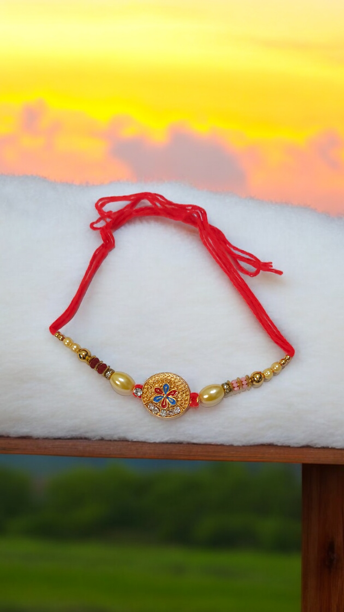 Introducing the Coin Rakhi - a modern twist on a traditional celebration. This beautifully crafted rakhi features a coin design, symbolizing prosperity and good luck. Perfect for brothers and sisters looking to exchange meaningful gifts. Celebrate with a touch of elegance and significance with the Coin Rakhi.