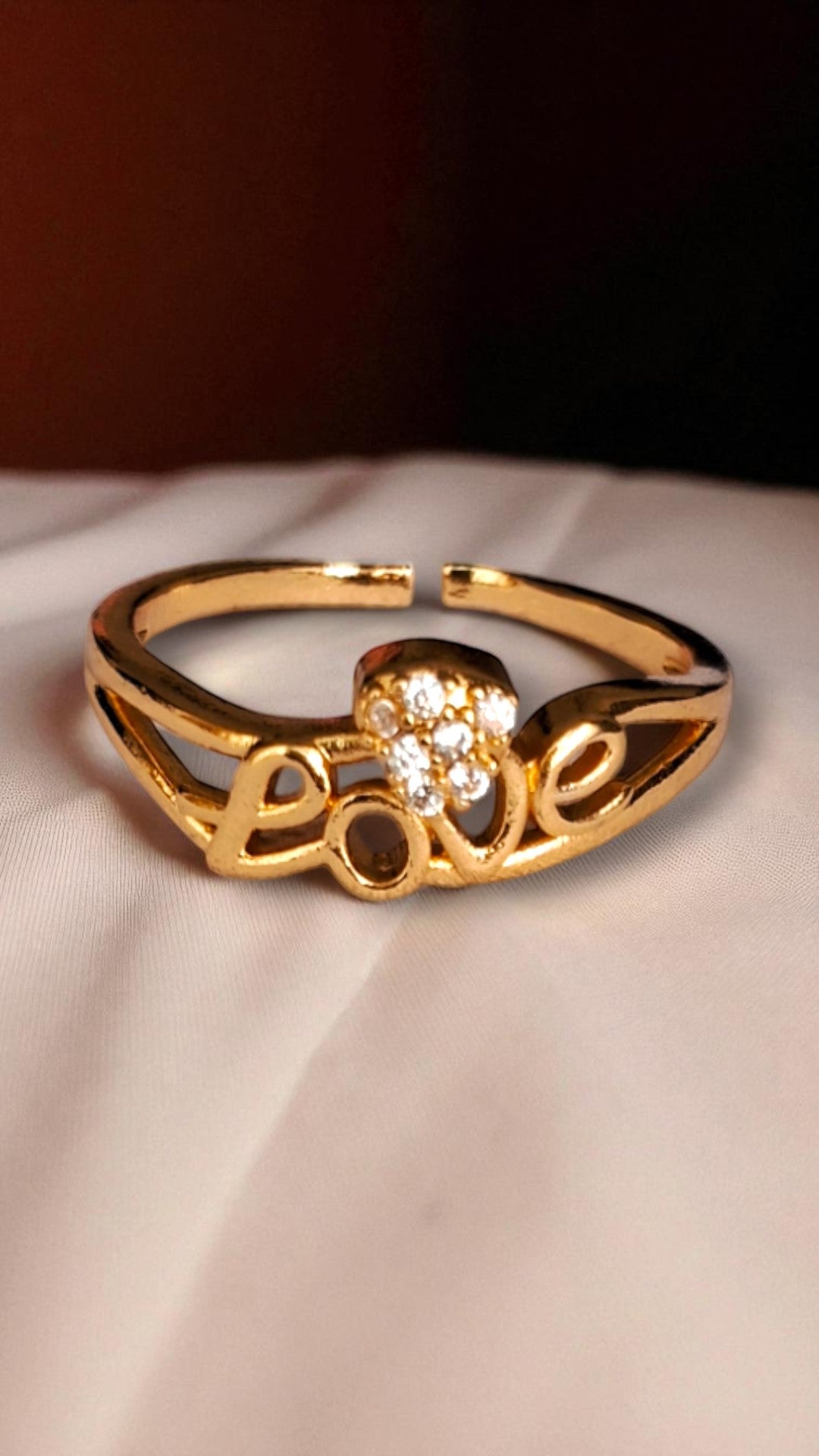 š Express your feelings in style with the Sparkling Love Finger Ring. Designed in a rich gold tone, this charming piece features the word Love in a graceful script, accented by a cluster of glittering stones forming a delicate heart at the center. A perfect blend of romance and elegance.