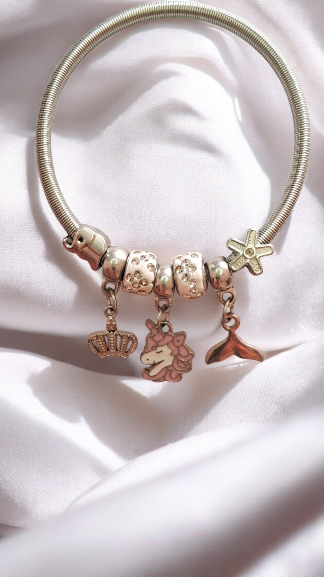 A magical blend of royalty and ocean dreams! The Royal Fantasy Charm Bracelet features sparkling charms including a crown, a pastel unicorn, a mermaid tail, and a starfish. With elegant rose-gold tones and shiny beadwork, itโs made for the dreamers and little queens of today!