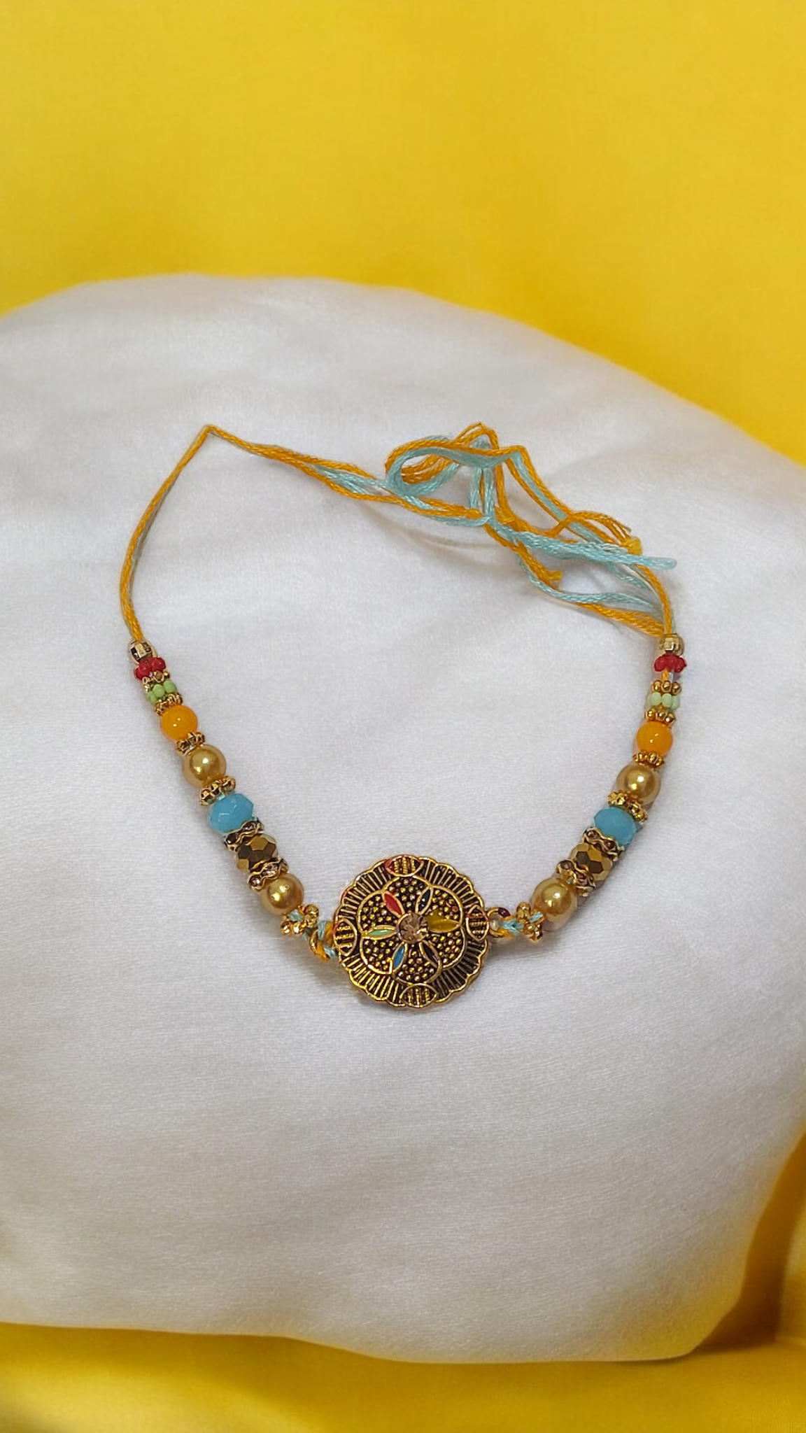 Add a touch of vibrancy to your Raksha Bandhan celebration with our Rainbow Circle Rakhi. Handcrafted with vibrant rainbow-colored threads, this rakhi symbolizes the unbreakable bond between siblings. Show your sibling some love with this unique and colorful rakhi.