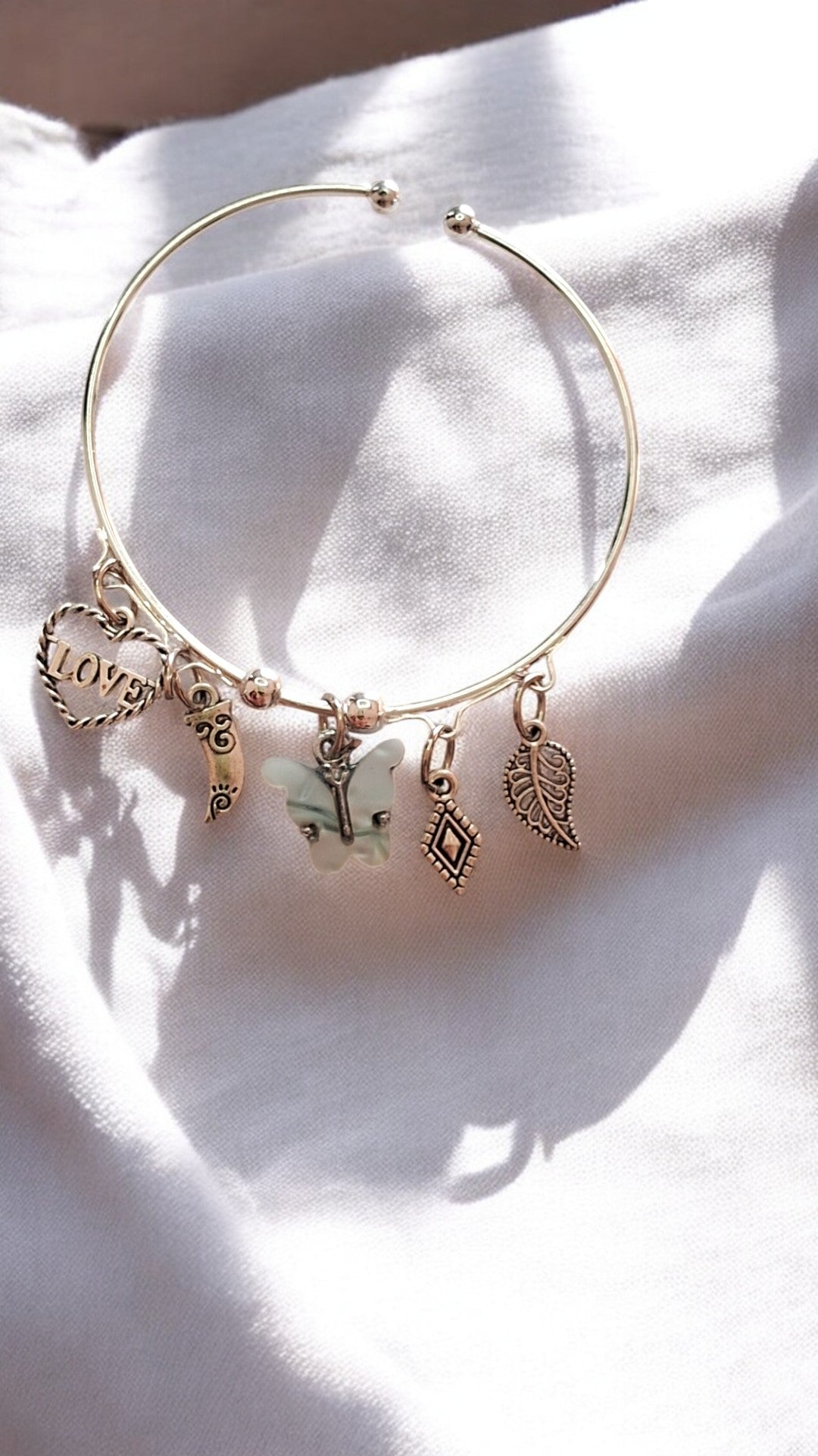 Carry symbols of love, journey, and transformation with the Soul Prints Charm Bracelet. Featuring a delicate white butterfly, engraved baby foot, paisley charm, and a diamond charm — this bracelet is perfect for those who walk through life with heart and soul.